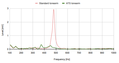 标准碳纤维唱臂的频响曲线显示,其在约 480 赫兹处存在明显共振。在此频段,振动幅度会对唱针循迹黑胶唱片纹路的能力产生可闻的干扰。而 ATS 技术则能确保唱臂不会对唱片机的音质产生负面影响。
