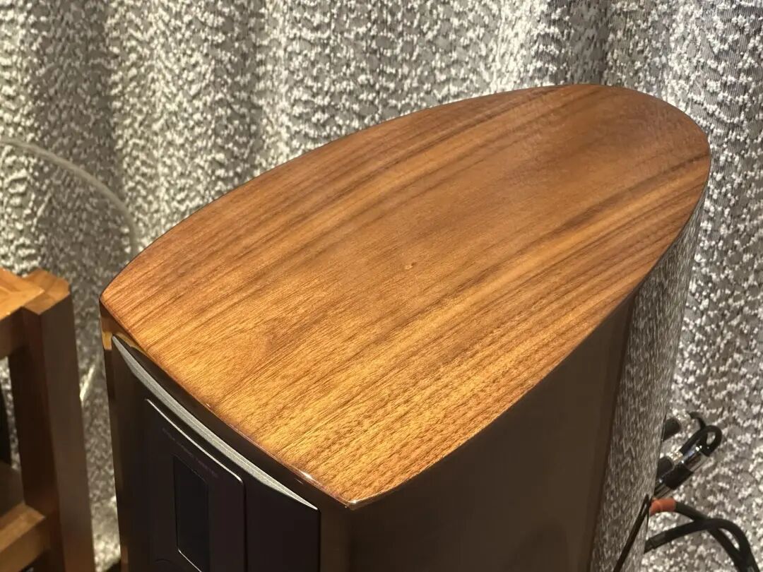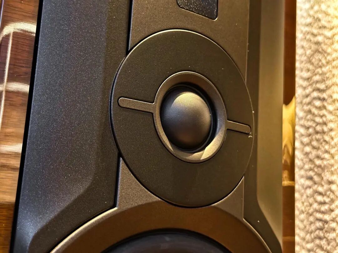 箱体采用 18mm 弧形 MDF 板,前障板厚达 40mm,辅以内部复合支撑和沥青阻尼层,稳固性非常高,能有效抑制箱体共振。外观提供三种高光饰面(黑色、栗色、胡桃木),实木贴皮加钢琴烤漆,既经典又能适配不同家居环境。
