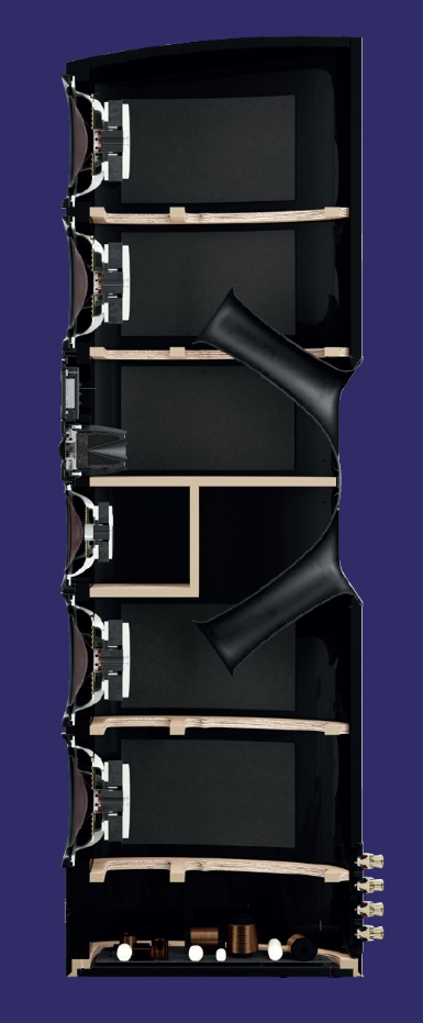 当我终于从它的外观魅力中平复心情,开始深入研究 EPIKORE 11 的技术设计时,我再次意识到,DALI 在研发这类音箱时,拥有多么深厚的工程技术积淀。我之前提到过 EPIKORE 箱体内部的加固结构,除此之外,上下两组低音单元均被分隔在各自 64 升的独立密闭空间内,每组单元都单独向外开孔,开孔调谐频率为 24 赫兹。混合双高音单元与中音单元区域也在总箱体内拥有独立的 6 升密闭空间,以最大限度优化单元的性能特性,减少低音单元带来的干扰。