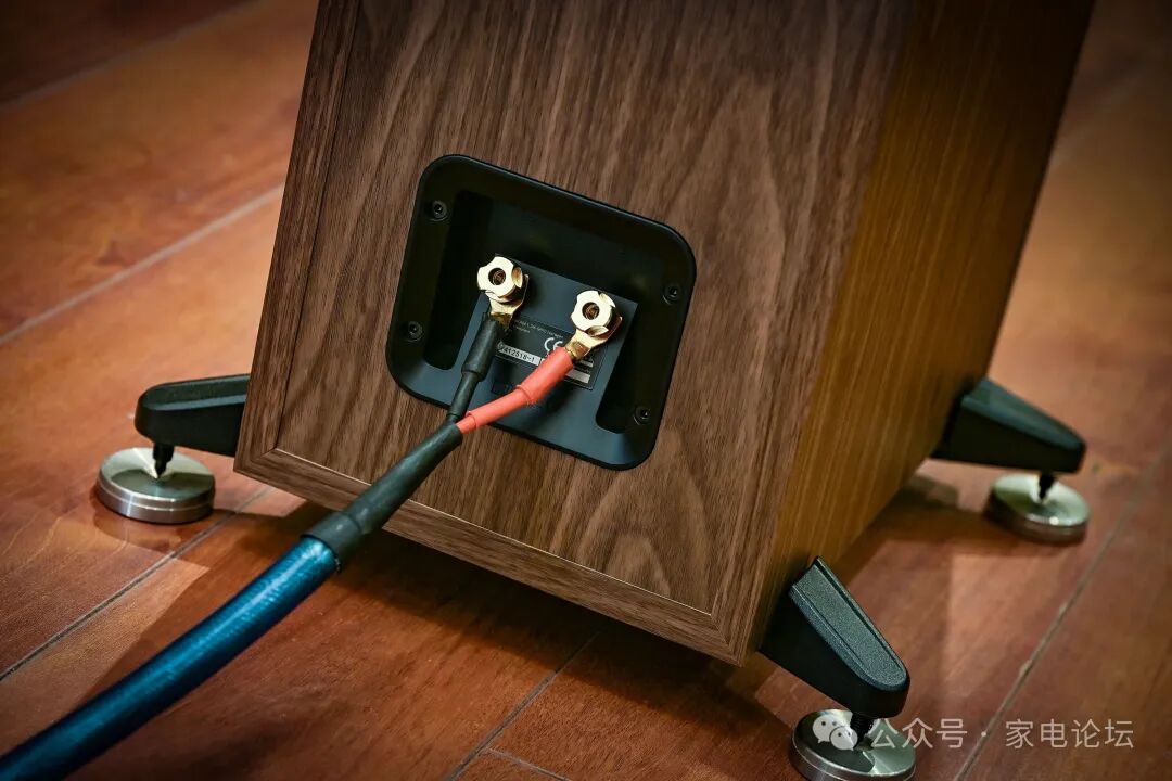 箱体背部最醒目的为大尺寸圆形低音反射端口,采用达尼经典的双扩口倒相孔结构设计,核心作用是优化气流流通效率,减少空气高速通过产生的湍流噪声与风噪,保障大音量、大动态场景下低频干净清晰、无拖沓轰鸣感,搭配 39Hz 箱体调谐频率,实现标称 36Hz 的超低频下潜,在同价位同尺寸落地箱中表现亮眼。倒相孔下方,是达尼为 SONIK 7 定制的高精度金属接线柱,接线柱采用镀金工艺处理,兼容裸线、香蕉插头与 Y 型插头等所有主流接线方式,适配性极强,能稳定传输大电流信号,避免接触不良带来的音质损耗。略有遗憾的是,SONIK 7 并未配备双线分音 / 双功放接线柱,不支持进阶的分线驱动玩法,这也是达尼基于产品定位做出的取舍。